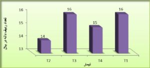 نتایج مقایسه میانگین به روش دانکن در نمودار (6) نشان می دهد که تیمار شماره T دارای بیشتری تعداد دانه در ردیف یک بلال بوده و کمترین تعداد ردیف بلال مربوط به تیمار شماره T1 می باشد.